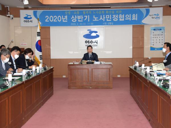 여수시 노사민정협의회가 22일 시청 상황실에서 위원장인 권오봉 여수시장을 비롯한 노사민정 관계자 40여 명이 참석한 가운데 상반기 회의를 열고 상생협력을 다짐했다.