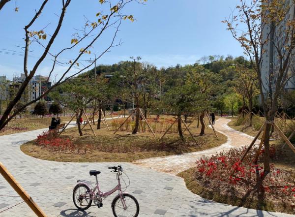 녹색 쌈지 숲이 조성된 이 공원에는 사전 주민설명회를 통해 수렴된 주민 의견을 반영해 소나무 등 수목 15종 136주, 남천 등 관목 11종 2천340주와 가우라 등 초화류 6종 1천800본이 식재됐다.