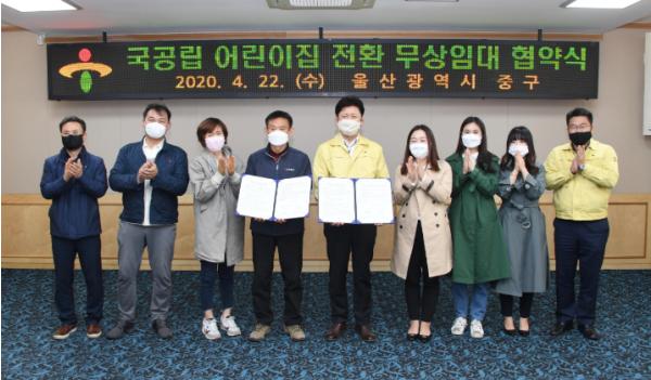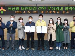 울산 중구가 지역 아파트 단지 내 어린이집의 국공립어린이집 전환을 위해 협약을 맺고, 시설 무.상임대 등에 나섰다.