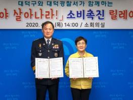 대전 대덕구(구청장 박정현)가 23일 구청에서 코로나19 영향으로 인한 경기침체 상황을 극복하기 위해 대덕경찰서(서장 변관수)와 ‘경제야 살아나라!’ 소비촉진 릴레이 협약을 체결했다.