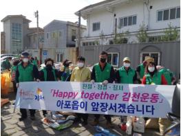 김천시 아포읍 새마을 남·여지도자 협의회(협의회장 박용복, 부녀회장 권경애)에서는 4. 22(수) 오전 8시 30분부터 새마을 남·여지도자 60여명이 참여한 가운데 깨끗한 환경지킴이 사업의 일환으로 아포읍의 산과 하천 그리고 들녘에 산재한 농약공병 수거 작업을 대대적으로 실시하였고. 김천시에서 역점적으로 추진 중인 「Happy together 친절·질서·청결 김천운동」의 정착을 위한 범시민적인 운동이 널리 확대될 수 있도록 모두가 참여하여 실천하였다.