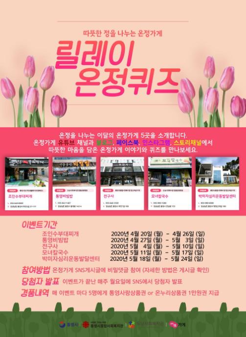 통영시(시장 강석주)는 4월 20일부터 5월 24일까지 기부활동에 참여하는 소상공인업체를 홍보하기 위한 “릴레이 온정퀴즈“ 온정가게 이벤트를 실시한다.