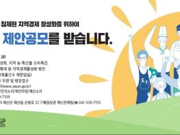 예산군은 코로나 19로 침체된 지역경제에 활력을 불어넣기 위해 군민을 대상으로 4월 20일까지 지역경제활성화 아이디어 제안을 공모한다고 밝혔다.