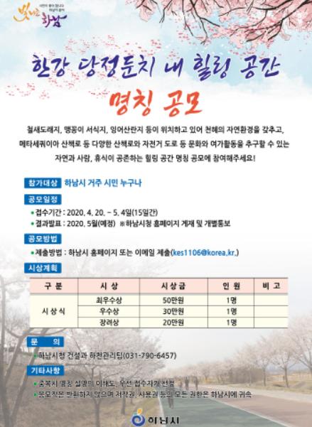 하남시는 한강 팔당(하남)지구 하천정비 사업이 완료됨에 따라 4월 20일부터 5월 4일까지 ‘한강 당정둔치’의 명칭을 공모를 실시한다.