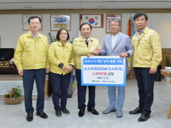 코로나19 국내 신규 확진자 추이가 확연한 안정세를 이어가고 있는 가운데, 지난 22일 가산면 소재 관내 마스크용 밴드 제조 생산 업체인 겨루 텍스타일(대표 서병조)은 손 소독제 8,400여개(2,400만원 상당)를 포천시에 기부했다.