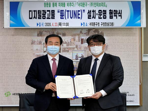 서대문구(구청장 문석진)가 벤처 광고업체인 ㈜인터브리드(대표이사 박재은)와 23일 구청장실에서 ‘옥내 디지털광고물 설치 운영 협약’을 맺었다.