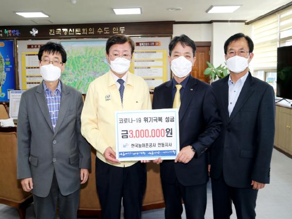 한국농어촌공사 안동지사(지사장 이수근)는 4월 22일 코로나19 확산 방지와 피해 지원을 위해 성금 300만 원을 안동시에 전달했다.