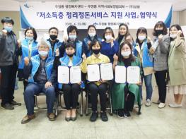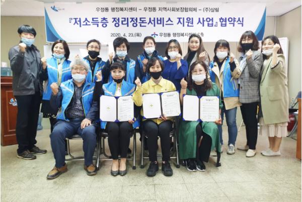 우정동 행정복지센터는 23일 오후 2시 3층 회의실에서 동 지역사회보장협의체, ㈜살림과 함께 ‘저소득층 정리수납서비스 지원 사업’을 추진하기 위한 업무 협약을 체결했다.