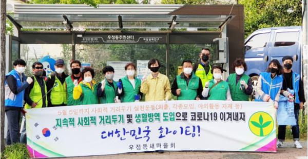 우정동 새마을협의회·부녀회로 구성된 방역 봉사자들은 매주 3회씩 정기적으로 지역 사회의 감염증 확산을 방지하기 위해 방역활동을 실시하고 있으며, 코로나19가 종식될 때까지 정기적 활동으로 감염증 예방을 도모하기로 했다.
