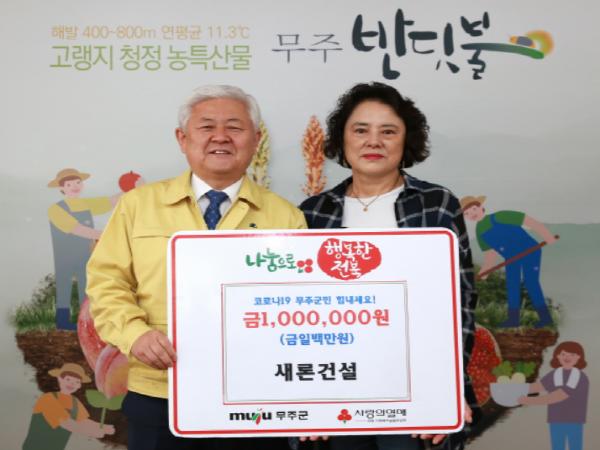 코로나19 예방과 극복 열기가 뜨거운 가운데 재난상황으로 어려워진 이웃을 돕기 위한 마음들도 끊이질 않고 있다. 지난 24일에는 새론건설에서 성금 1백만 원을, 무진장축산업협동조합에서도 1백만 원의 성금을 기탁해왔다.