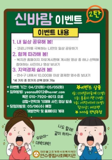 연수종합사회복지관은 다음달 5일까지 코로나19 상황 속 일상을 공유하기 위한 이벤트를 진행한다. 이벤트는 내 일상을 공유해 봄!, 복지관 동영상을 함께 공유해 봄!, 지역경제를 살려 봄! 세 부분으로 진행된다.