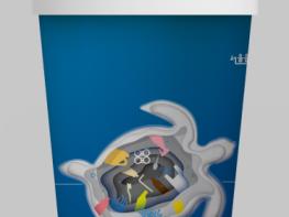 쓰레기를 먹은 바다거북이와 돌고래의 뱃 속이 보이는 그림과 함께 ‘한 번의 일회용품 사용, 자연의 생명이 사라져요’란 문구를 넣었다.
