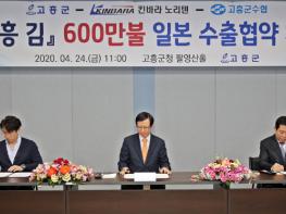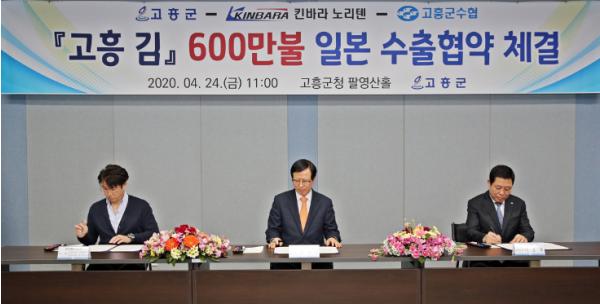 고흥군(군수 송귀근)은 24일 일본 기업, 고흥군수협 등 수출업체가 참석한 가운데 고흥 김 600만불 일본 수출협약을 체결했다고 밝혔다.