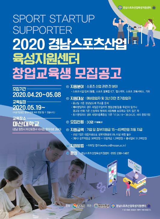 모집 기간은 4월 20일(월)~5월 8일(금)까지이며 자세한 공모내용은 경남 스포 츠산업 육성지원센터(http://www.masan.ac.kr/g-musports/Main.do)에서 확인할 수 있다.